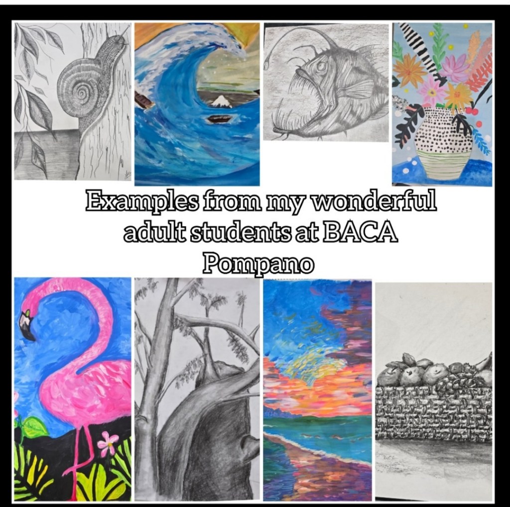 Sign up for adult beginners painting/drawing classes with Rishona at BACA Pompano. 10am-1pm every first and third Saturday of the month! https://www.pompanobeacharts.org/baca
